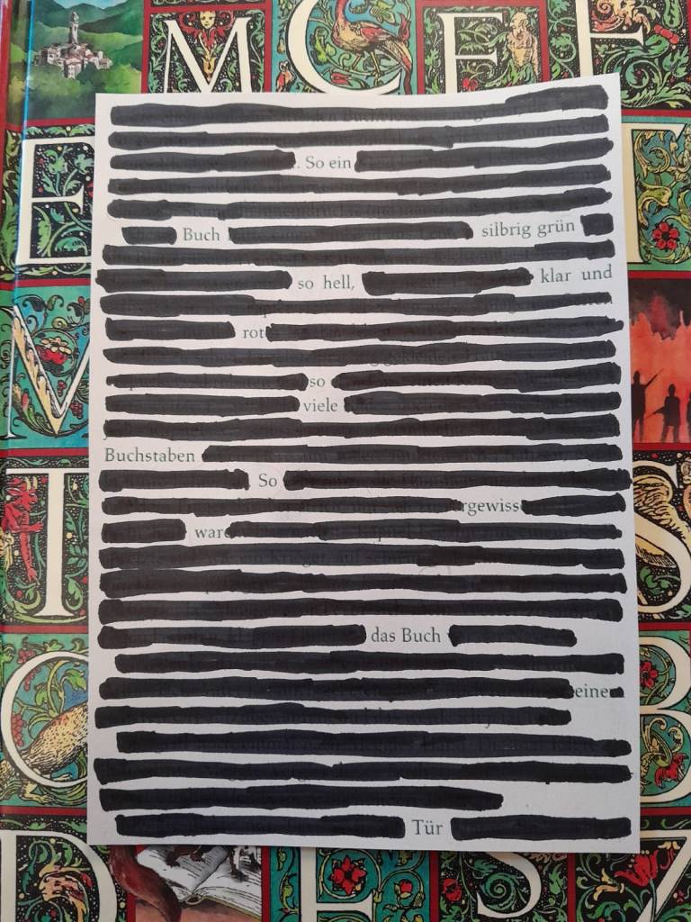 Blackout ist Englisch und bedeutet „Stromausfall“, und hier eher „schwärzen“ und darum geht es bei Blackout Poetry: ein vorhandener Text wir bis auf wenige Wörter geschwärzt, zum Beispiel mit einem dicken schwarzen Filzstift, und die resultierenden Wörter geben der Seite einen neuen, oft poetischen oder humoristischen Sinn.